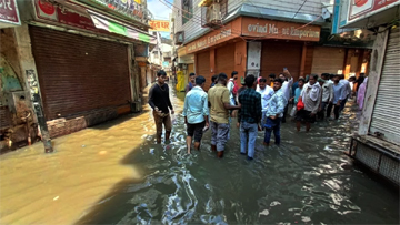 ठाकुर बांकेबिहारी मंदिर के समीप पहुंची बाढ़, दुकानों के अंदर भरा पानी