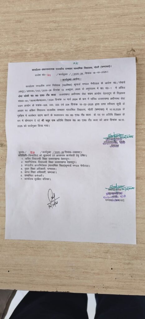 जानकारी के अनुसार, 16 अक्टूबर को चम्पावत जिले के गोली राजकीय उच्चतर माध्यमिक विद्यालय से चतुर राम, सिंगदा से प्रमोद परगांई, निलोटी से नेहा, मंच जीआईसी से आभा जोशी और बापरू से राखी गहतोड़ी सहित कई शिक्षकों को कार्यमुक्त किया गया है। इन सभी शिक्षकों ने वर्षों तक अपने-अपने विद्यालयों में अतिथि शिक्षक के रूप में सेवाएं दी थीं। दीपावली जैसे पर्व से पहले नौकरी छूटने से उनके सामने आर्थिक और मानसिक संकट खड़ा हो गया है।
