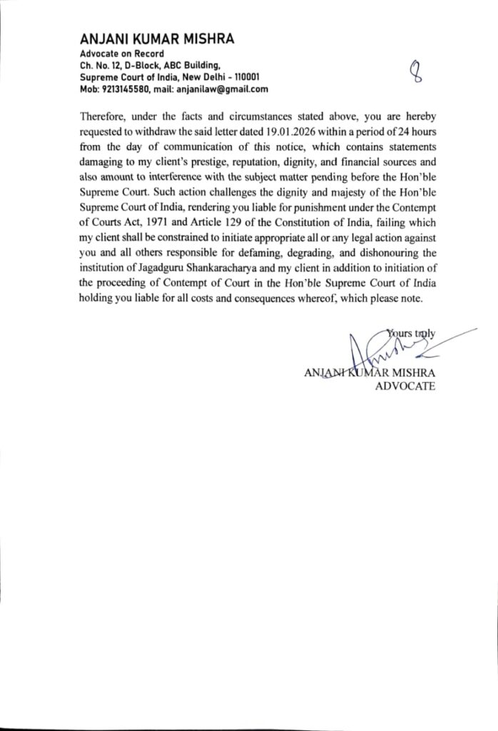 उन्होंने बताया कि स्वामी अविमुक्तेश्वरानंद महाराज के उच्चतम न्यायालय के अधिवक्ता ने प्रयागराज मेला प्राधिकरण को 19 नवंबर को दी गई नोटिस का जवाब मेल आईडी पर भेजा है। इसमें कहा गया है कि मेला प्राधिकरण 24 घंटे में नोटिस वापस नहीं लिया तो उच्चतम न्यायालय के अवमानना का जिम्मेदार होगा। उन्होंने कहा कि प्राधिकरण ने स्वामी अविमुक्तेश्वरानंद महाराज की आमजनमानस के बीच में छवि धूमिल धूमिल करने का काम किया है। इसलिए उच्चतम न्यायालय में मानहानि का मुकदमा भी दाखिल किया जाएगा।