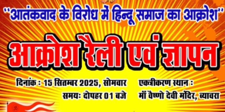 सकल हिन्दू समाज सोमवार दोपहर 1 बजे मां वैष्णोंदेवी धाम मंदिर पर एकत्रित होगा, जहां से सुभाष चैक, पीपल चैराहा तक आक्रोशित रैली निकाली जाएगी। सकल हिन्दू समाज पीपल चैराहा पर देश विरोधी तत्वों का समर्थन करने वालों पर कठोर कार्रवाई की मांग, पिछले साल नरसिंहगढ़ व राजगढ़ में फिलस्तीन झंडा फहराने, ब्यावरा शहर में 5 सितम्बर को ईद जुलूस में सेव फिलीस्तीन, सेव गाजा के स्टीकर लगाने के मामले में जांच और पूर्व में आंतकवादी गतिविधियों में लिप्त लोगों की सम्पत्ति जांच की मांग को लेकर एसपी को ज्ञापन सौंपेगा। इसके साथ ही सकल हिन्दू समाज ने आगामी दिनों में आंतकवाद के विरोध में जिला मुख्यालय पर बड़ा प्रदर्शन करने की बात कही है।