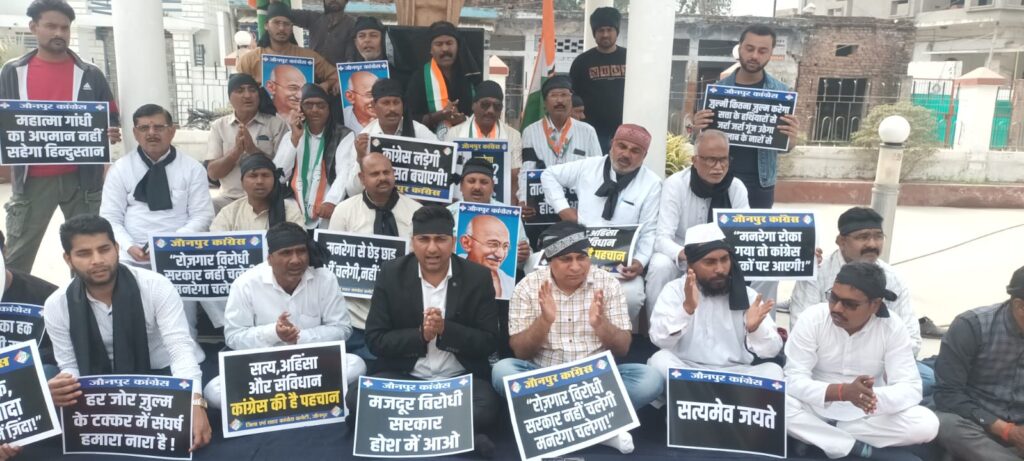 जौनपुर। उत्तर प्रदेश के जनपद जौनपुर में जिला कांग्रेस कमेटी के अध्यक्ष डॉ. प्रमोद कुमार सिंह के नेतृत्व में पार्टी कार्यकर्ताओं ने आज महात्मा गांधी की प्रतिमा के समक्ष धरना-प्रदर्शन किया। इनका आराेप है कि लखनऊ में शांतिपूर्ण विधानसभा घेराव के दौरान कांग्रेस कार्यकर्ताओं पर लाठीचार्ज किया गया है।